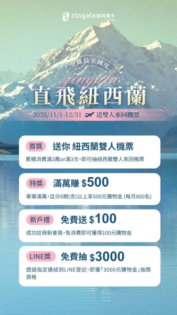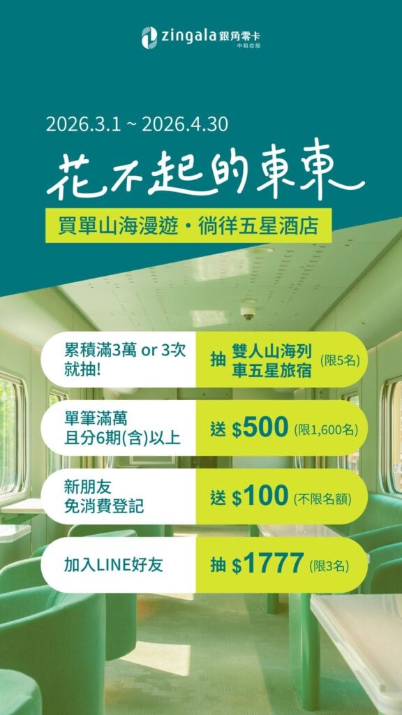 一起飛旅遊適用於zingala銀角零卡,一元中租Coin等同於一元台幣,每筆皆能100%折抵無上限!